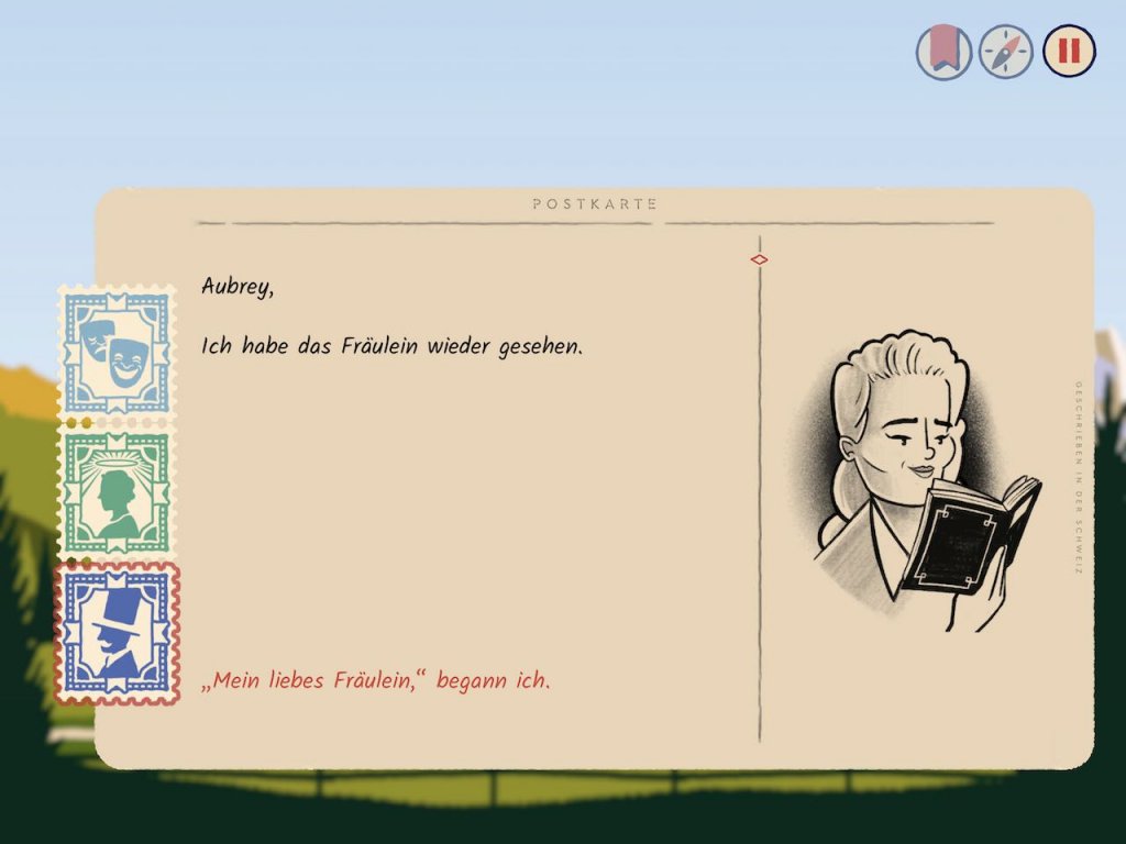 Die Briefe, die an einen ominösen Aubrey gesendet werden, erzählen nämlich in feinster Prosa, was so abgelaufen ist. Es gibt Briefmarken, die für eine ehrliche und aufrechte Antwort stehen, aber auch Sarkasmus, Bedrohung und Höflichkeit sind oft eine Option. Je nachdem, wie ihr euer Verhalten im Zaum habt (oder auch nicht), verändern sich die Reaktionen der Charaktere rund um euch. Das kann sogar so weit gehen, dass sich teilweise neue Pfade in Over the Alps öffnen, oder aber manche augenblicklich schließen.