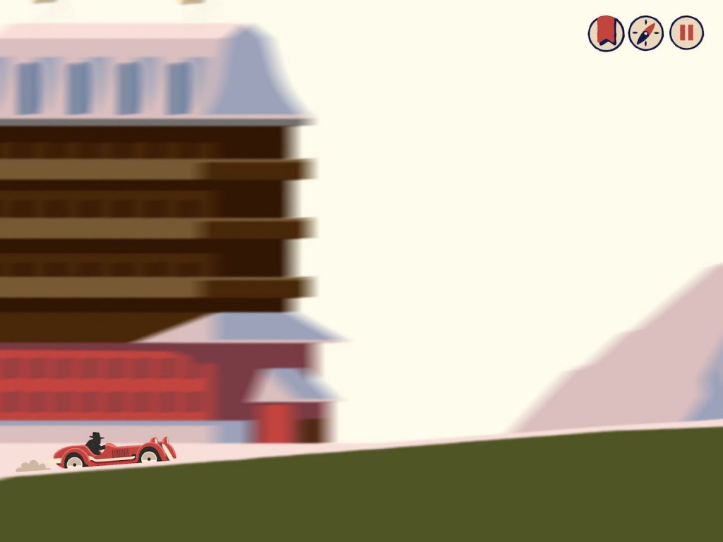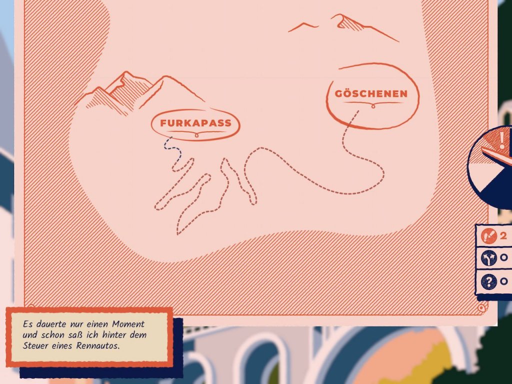 Was Optik und Sound angehen, hier kann Over the Alps ungewöhnlich auftrumpfen. Die kleinen Suchbilder, mit denen ihr die nächste Interaktion anstoßt, sind liebevoll gestaltet und farbenfroh. Nicht nur das, es gibt auch einiges auf die Ohren: Quietschende Reifen und coole Hintergrundmusik untermalen das Geschehen, das sich am iOS-Gerät mit Text und somit rein in eurem Kopf abspielt. Etwas schade ist zwar, dass ihr nur einen Spielstand in Over the Alps habt. Wenn ihr also neu beginnt, überschreibt ihr den alten Spielstand gezwungenermaßen – das hätte nicht sein müssen.