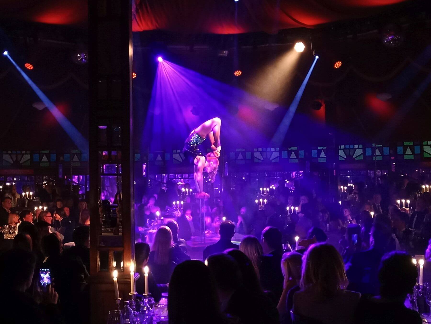 Ich entschied mich für das Fleischmenü und gleich vorne weg, jeder Gang war wirklich hervorragend. Besonders wurde aber auf die Vielfalt für die Geschmacksknospen geachtet. Angefangen vom Avocado-Tartar, das von einer sehr schmackhaften weißen Zwiebelsuppe abgelöst wurde und dann vom zarten Rinderrücken gekrönt wurde, war für viele Geschmäcker etwas dabei. Danach gab es noch Kaffee und ein herrliches Schokoladenparfait. Schon beim darüber Schreiben wünschte ich, ich hätte noch eines vor mir. Kulinarisch war der Abend daher für mich rund um gelungen. Das Essen war ausgezeichnet und auch die Weinbegleitung und der Service mit viel Personalaufwand waren perfekt, wodurch man sich zwischen und nach den Gängen sehr gut den Fokus auf das künstlerische Geschehen lenken konnte. Deshalb wechseln wir jetzt auch von meinem Tisch zur Manege, wo zwölf verschiedene Künstlergruppen auf der Bühne standen.