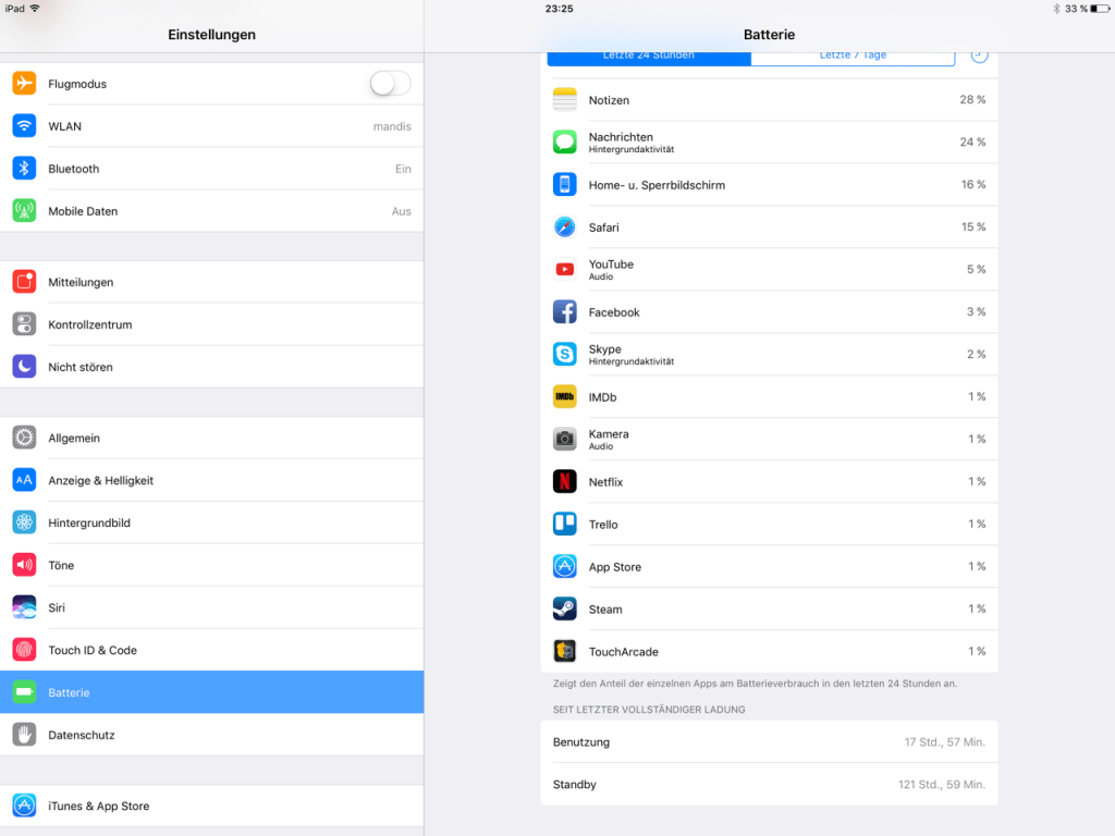 Liegt es an anderen Faktoren? Wir wissen es nicht, das könnte uns nur der Konzern aus Cupertino beantworten. Es muss ja nicht gleich eine Verdoppelung der Akkulaufzeit sein, schließlich berührt man das Smartphone doch öfter als das Tablet. Das liegt am größeren Screen, der mehr zugleich anzeigen kann und man folglich weniger oft scrollen muss. Aber schon 50 % mehr Akkulaufzeit ohne sichtbare Einschränkung? Ja bitte!