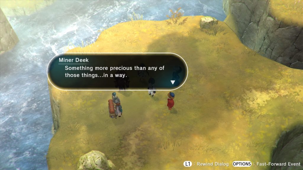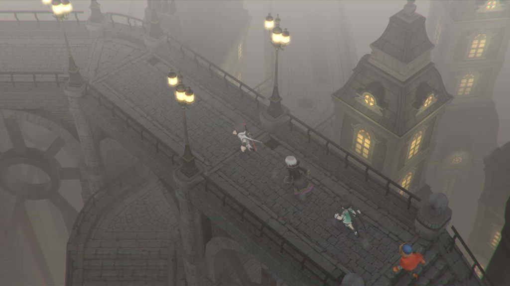 Eine Schnellspeicherfunktion sowie die Möglichkeit Storysequenzen vorzuspulen sind weitere „moderne“ Annehmlichkeiten, die von Beginn an im Spiel verfügbar sind. Auch das genretypische Grinding sucht man in Lost Sphear (zum Glück!) vergebens. Die Dungeons sind allesamt recht linear aufgebaut. Hier und da gibt es mal eine kleine Abzweigung mit einem zusätzlichen Kampfszenario oder einer Schatzkiste, doch verlaufen kann man sich nicht. Auch auf Zufallskämpfe wurde verzichtet. Stattdessen sieht man die Gegner bereits von der Ferne; erst, wenn man ihnen nahe genug kommt, beginnt der Kampf.
