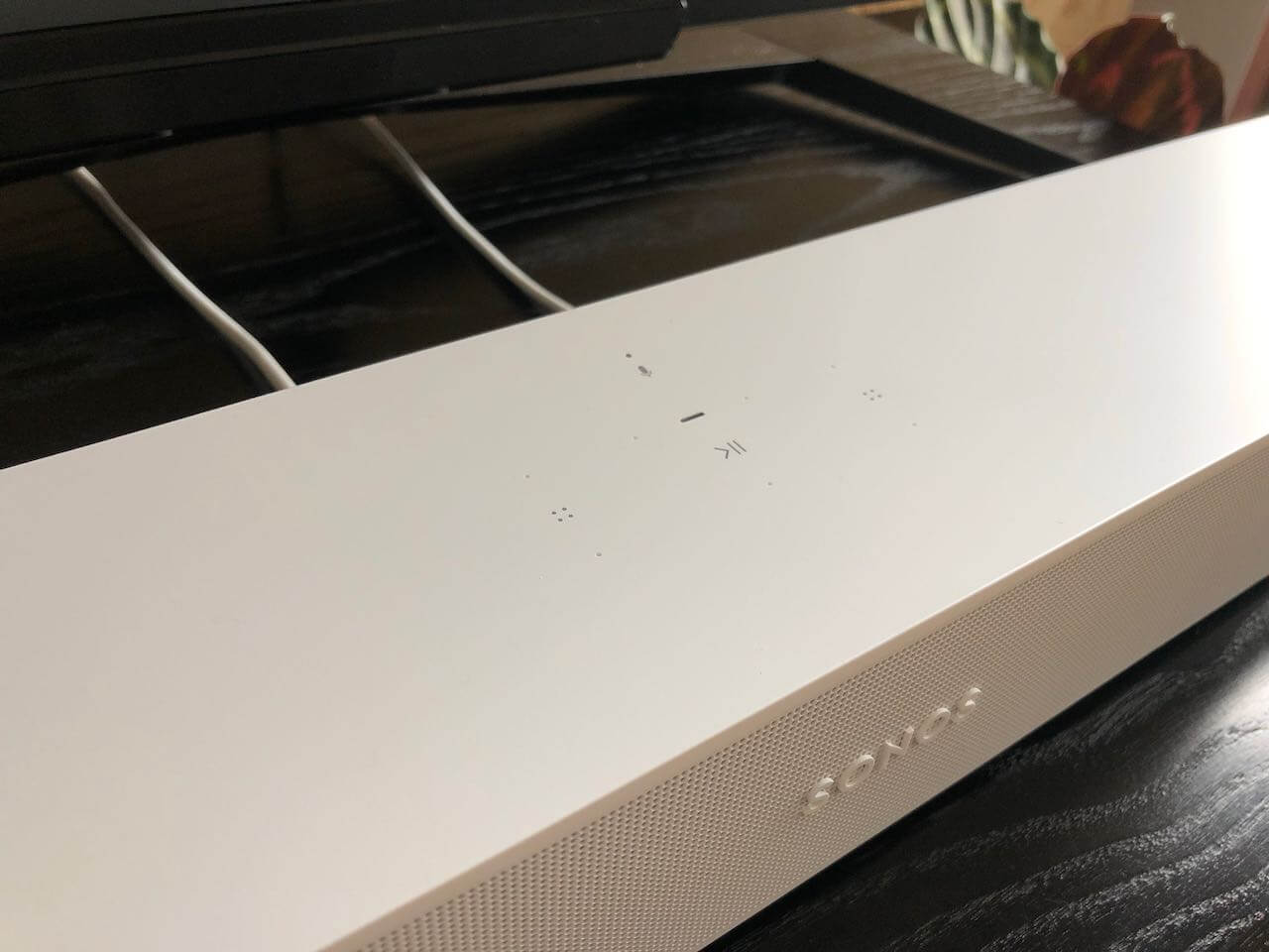 Dazu zählen ein Cortex A53-Vierkernprozessor (1,4 GHz) mit 1 GB Arbeitsspeicher und 4 GB Speicher, der unter anderem für Systemupdates bemüht wird. Ein Ethernetport mit bis zu 100 Mbps ist mit von der Partie, und WLAN wird sowohl im 2,4 GHz- als auch im 5 GHz-Frequenzband unterstützt (solange ihr kein Mesh-WLAN verwendet, so scheint es mir). Am Gerät direkt könnt ihr mittels Touchflächen lauter und leiser stellen, die Wiedergabe starten und pausieren – oder aber via Sonos-App eine eurer Fernbedienungen anlernen, damit ihr nicht ständig zur Beam (Gen 2) hingehen müsst.
