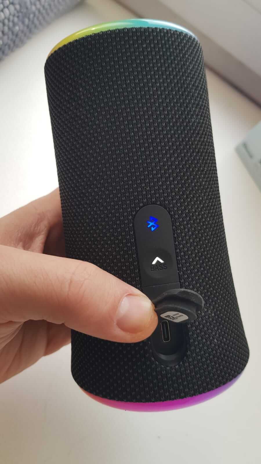 Darunterliegend befindet sich hinter einer wasserdichten Abdeckung der USB-C-Anschluss zum Laden des Soundcore Flare 2. Ankers Mini Disco verfügt nämlich wie auch der Vorgänger über eine IPX 7 Zertifizierung, sprich das perfekte Teil für die Beschallung eurer Poolparty im Sommer. Fällt die Box mal ins Kühle nass, kann das Teil darin also gut und gerne mal kurz untertauchen und ihr könnt euch trotzdem sicher sein, dass die Musik nicht zu spielen aufhört.