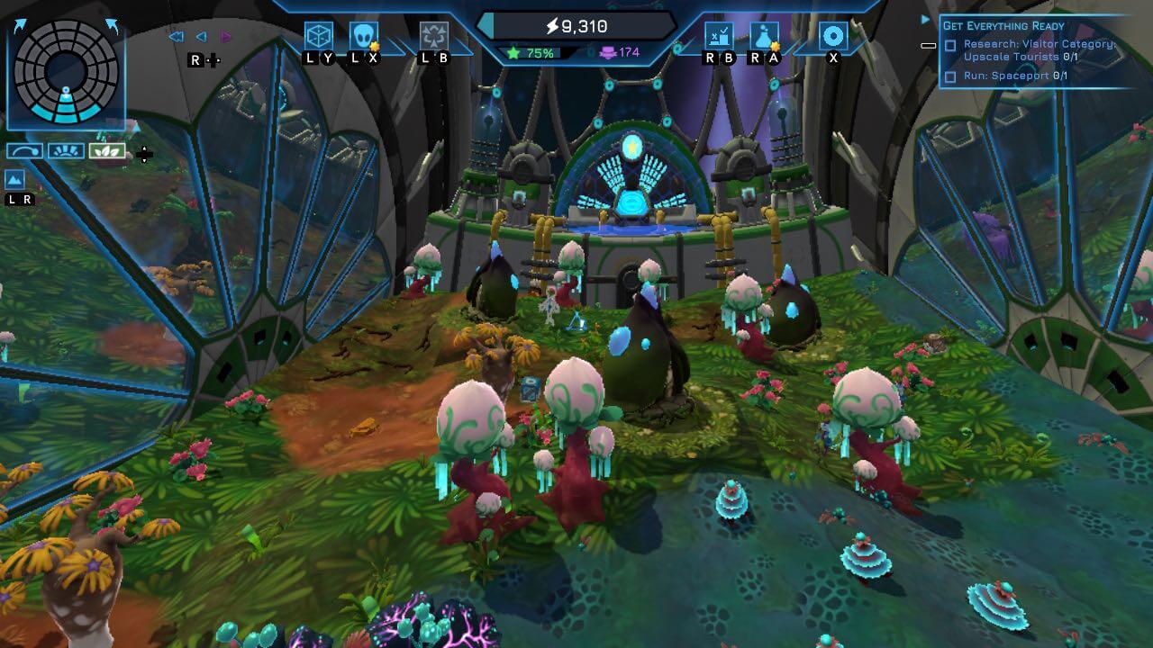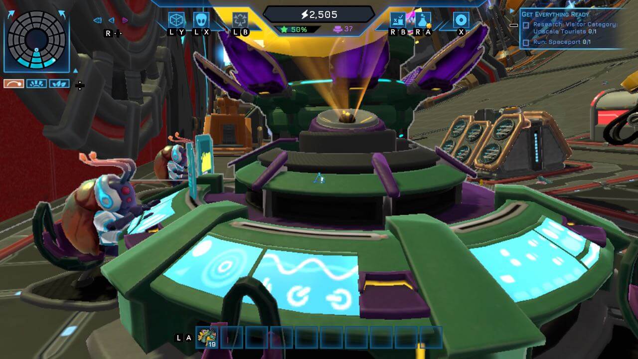 Was die Optik angeht, ist Spacebase Startopia nicht gerade ein Glanzpunkt auf der Konsole. Die Animationen laufen zwar gut ab, aber spätestens ab der dritten Stufe wuselt es so ordentlich, dass der Überblick über Müll und Aliens verloren geht. Auch die Soundabteilung ist bestenfalls als zweckmäßig zu bezeichnen, und die Musik tut ihr Bestes, um sich aus dem Gameplay (das Spielen in verschiedensten Menüs) herauszuhalten. Der dritte wichtige Punkt bei der Technik ist die Steuerung, und diese ist auf der Nintendo Switch ziemlich brutal umgesetzt. Screenshots zeigen, wie befüllt der Controller ist.