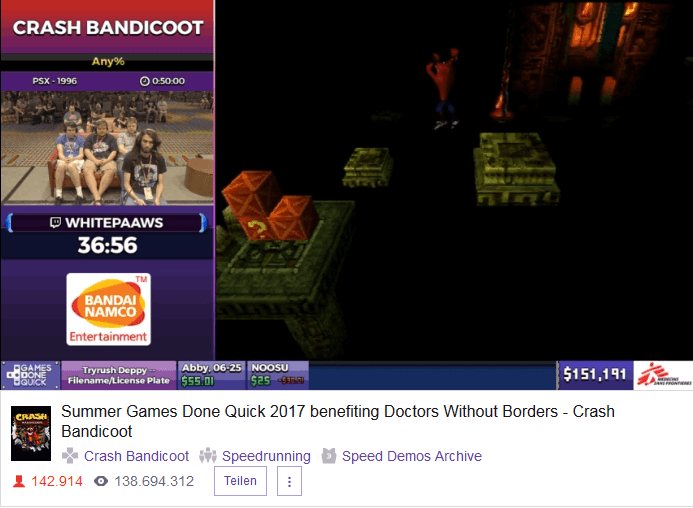 Während ich diese Zeilen schreibe, läuft gerade Crash Bandicoot über den Bildschirm, doch weitere spannende Speedruns werden über die nächsten Tage folgen. Ich freue mich schon auf Mirror’s Edge, I Am Bread, Brothers: A Tale of Two Sons, Dishonored 2, Super Meat Boy, Kirby: Planet Robobot, Shadow of the Colossus, Portal, Final Fantasy VII, Dark Souls 3 und The Legend of Zelda: Majora’s Mask. (Wie ihr aus der Liste vielleicht schließen könnt, gehöre ich zur Zuschauerkategorie „darüber staunen, wie schnell Profis durch Spiele jagen, für die man selbst zig Stunden gebraucht hat“.)