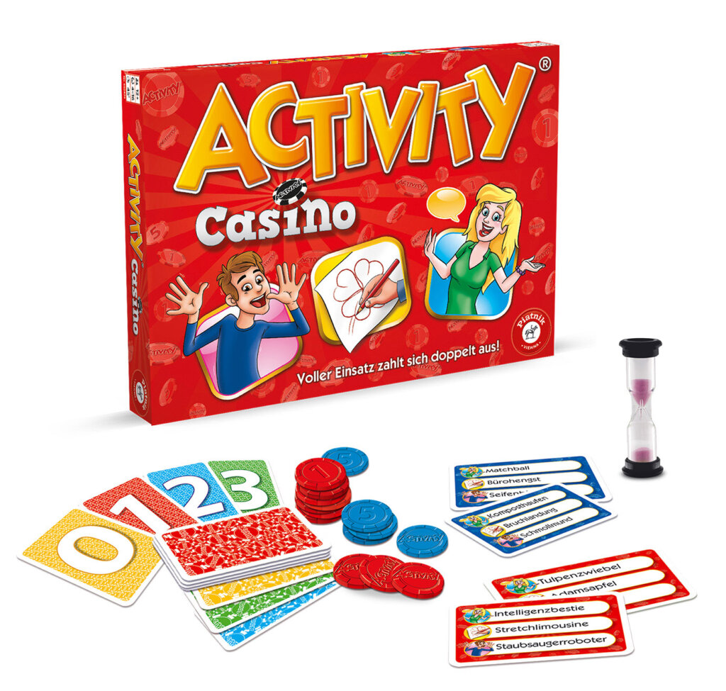 Mit Activity Casino hat Piatnik eine neue Edition des spannenden Kommunikationsspiels veröffentlicht, bei dem es auf jeden Einsatz ankommt. Das einfache Grundrezept des Klassikers – das Erraten von Begriffen – steht dabei wiederum an erster Stelle, doch geht es jetzt um die richtige Portion Risiko.