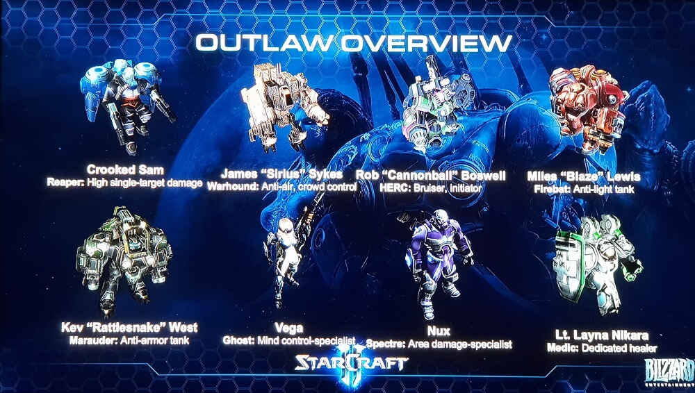 Tychus kann im Spiel bis zu vier seiner acht Outaws rekrutieren, damit sie ihm im Kampf zur Seite stehen. Zur Auswahl stehen beispielsweise der Feuerfresser Miles „Blaze“ Lewis oder der Ghost Vega.