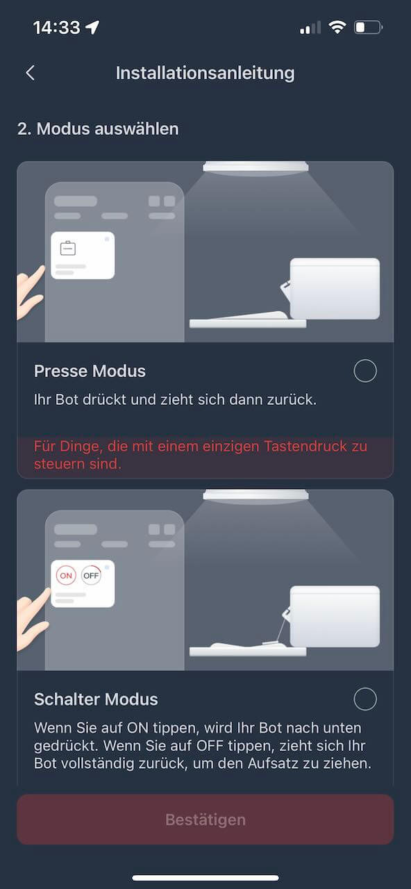 Habt ihr die SwitchBot-App heruntergeladen, werdet ihr sogleich an der Hand genommen. Die App zeigt euch nämlich sofort sämtliche Produkte in der Nähe an, die aktiviert wurden, und so sah ich augenblicklich den Bot, der vor mir lag. Nach einem Tipp standen mir schon einige Möglichkeiten zur Verfügung, etwa den Modus zwischen Press- und Schaltermodus zu wechseln, den Batteriestand und die Firmware zu prüfen, ein Passwort oder einen Zeitplan zu erstellen, aber auch, das Produkt erstmalig zu koppeln. Also machte ich das, und Schritt für Schritt wird euch mit Bildern erklärt, welche Einstellung was genau macht.