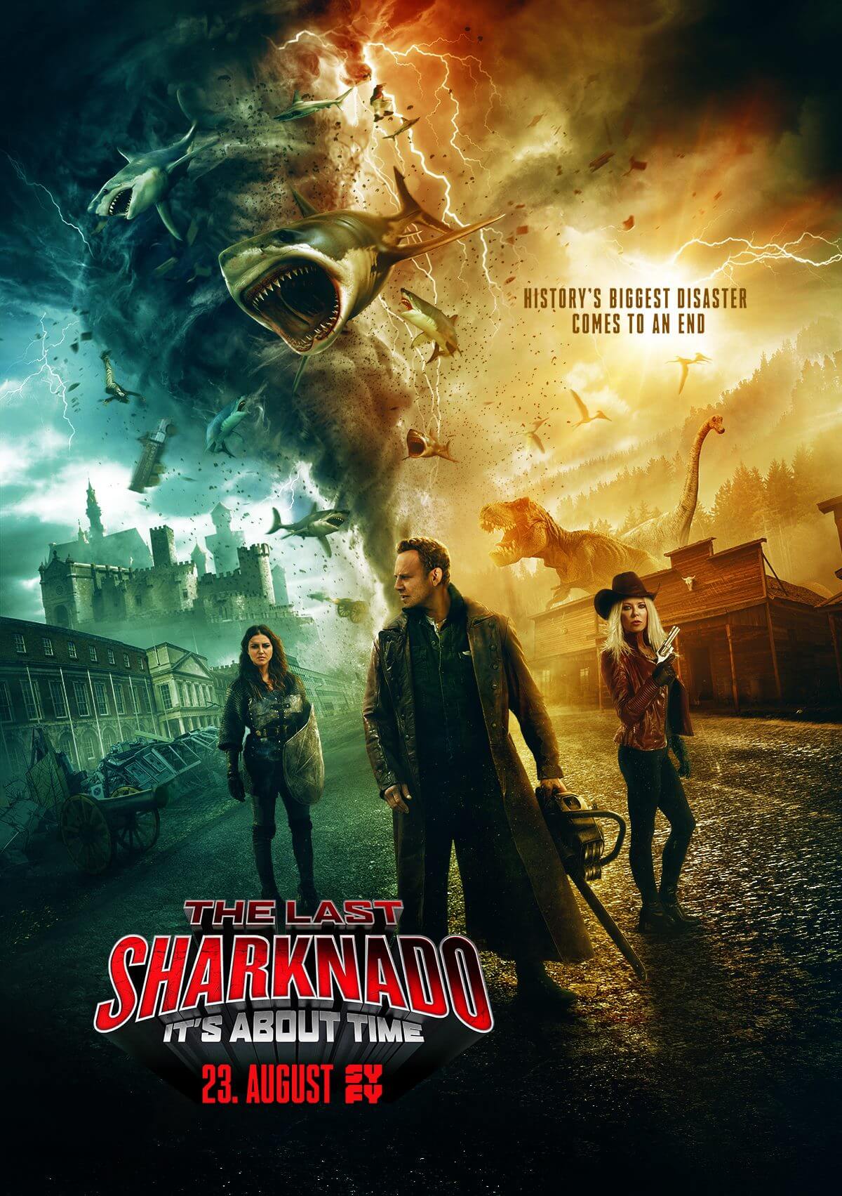 Unser Held Fin (Ian Ziering) kehrt zusammen mit Tara Reid und Vivica A. Fox (Sharknado 2) in Sharknado 6 wieder zurück auf den Bildschirm und dieses Mal scheint es die HeldInnen durch verschiedene Zeitepochen zu katapultieren. Am Poster sieht man von links nach rechts das Mittelalter, Dinosaurier und den Wilden Western. Wenn ihr nun die Augenbraue hochzieht, ist das absolut berechtigt. Der letzte Sharknado wird nochmals alles auffahren, um die Trashfans in Ekstase zu versetzen.