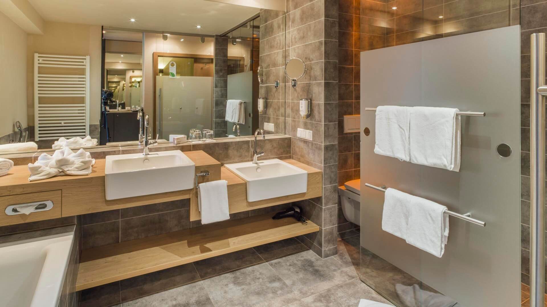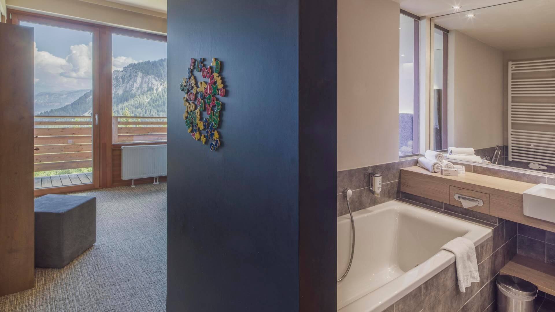 Während der Schlafbereich sehr platzsparend ausgestaltet ist (es gibt eine extra Schlafkoje für die Kinder), ist dort, wo man Platz braucht auch genügend vorhanden und zwar im Badezimmer (hier gibt es auch ein eigenes Kinderwaschbecken!). Nach dem Skifahren oder dem Wellnessen ist das Badezimmer wohl der bestbesuchteste Ort im Zimmer und deshalb ist es auch gut, dass hier entsprechen viel Platz vorhanden ist. Neben der Kinderkoje war für unsere Tochter vor allem eine Magnetwand mit Magnetbuchstaben äußerst spannend. Während wir alles ausgepackt haben, beschäftigte sich unsere Kleine mit diesen Magneten selbst. Minibar, Föhn im Badezimmer, zwei Fernseher, W-LAN, ein Safe etc. sind auch vorhanden. Hier ein paar Fotos vom Zimmer direkt vom Hotel: