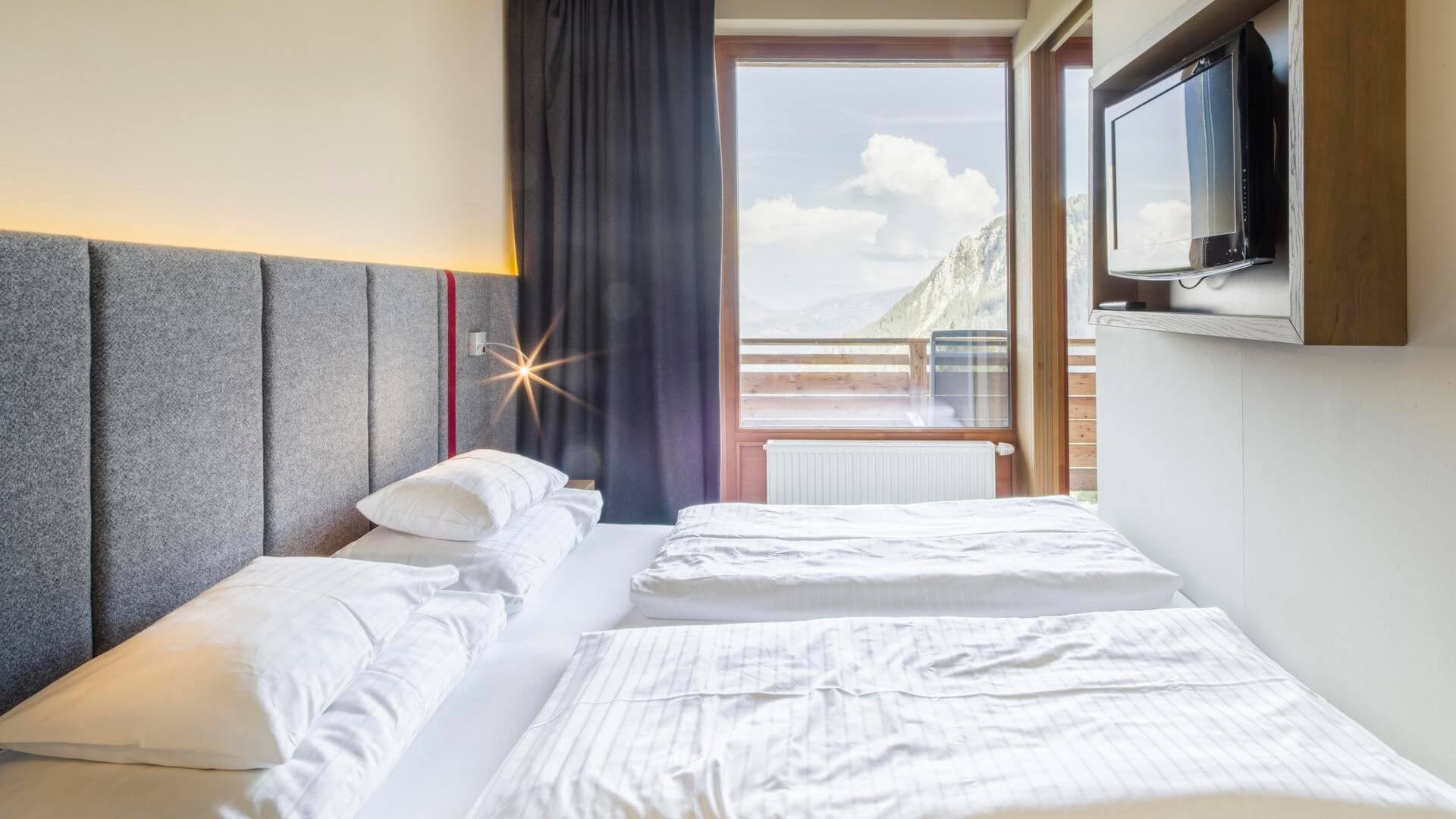 Alles kein Problem! Je nach Anforderung hat das Hotel in allen drei Kategorien etwas zu bieten. Wir hatten ein Familienzimmer Comfort, bei dem der Platz sehr gut genutzt wurde. Bevor wir noch die Taschen zu Boden gestellt haben, genossen wir aber mal die Aussicht, die den Gartnerkofel samt Kammleitn in seiner voller Pracht zeigte. Mit strahlend blauem Himmer im Hintergrund und noch etwas Schnee für die Skifahrer:innen.
