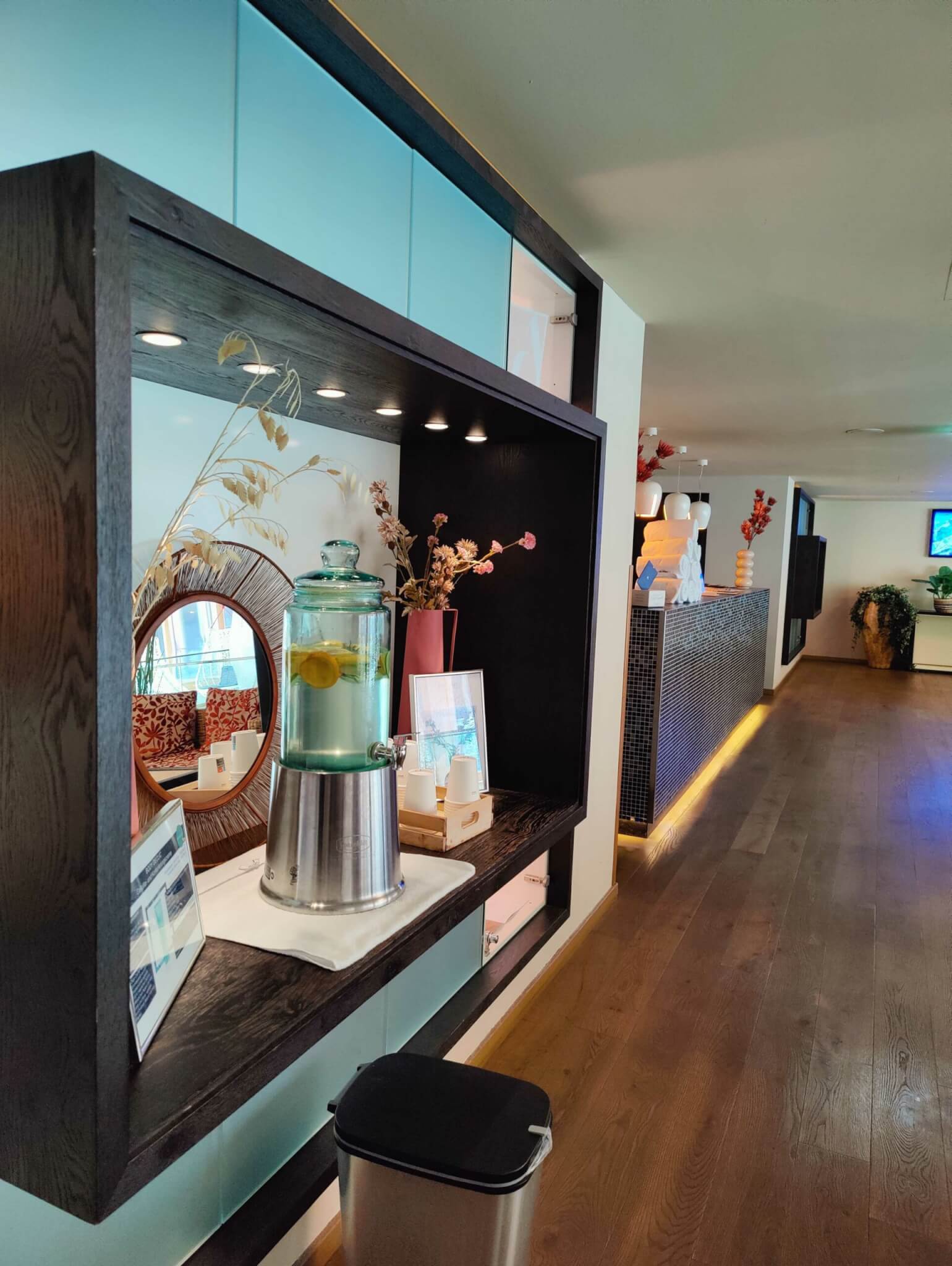 Bevor wir unsere Entdeckungsreise durch das Hotel starteten, konnten wir uns von der Reise durch eine Stärkung beim Nachmittagssnack erholen. Ein paar Küchlein, eine Suppe und ein Gulasch mit Knödel gab es hier im Angebot. Dazu konnten wir gleich auch einen kostenlosen Welcome-Drink an der Hotelbar genießen. Essenstechnisch setzt das Hotel auf ein reichhaltiges Buffet bei allen Mahlzeiten – egal ob Frühstück, Mittagessen, Snack oder Abendessen. Es gibt immer ein umfangreiches Angebot mit eigenen Kindergerichten (z.b. Pasta) aber auch viel fleischlose Optionen. Bis auf den Nachmittagssnack gibt es auch immer zumindest Wasser (still oder spritzig) im Angebot (meistens aber auch wesentlich mehr). Das Personal beim Essen ist – wie auch ausnahmslos im ganzen Hotel – äußerst zuvorkommend (z.b. Abservieren von leeren Tellern), hilfsbereit und geduldig (z.b. bei der Frage nach dem Weg oder ähnlichem) . Klasse! Meine kulinarischen Highlights waren ein toskanischer Hühnersalat und Panna Cotta mit Fruchttopping.