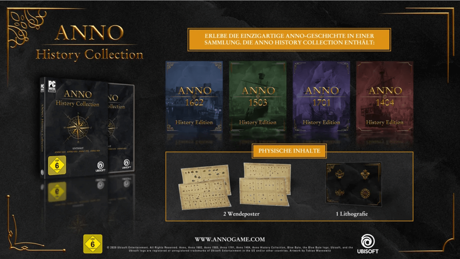 Die Retail-Version der Anno History Collection ist ab dem 25. Juni ausschließlich im Handel verfügbar. Sie enthält neben den digitalen Inhalten 2 exklusive doppelseitige Produktionsketten-Poster und eine exklusive Lithographie mit Goldprägung. Digital wird sie auch im Ubisoft Store erhältlich sein.
