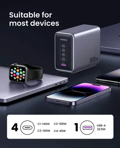 Wie es sein Name sagt, kann dieser Lademeister insgesamt bis zu 300 Watt zur Verfügung stellen. Bei der vollen Belegung sämtlicher Buchsen – siehe Galerie gleich drüber – bietet das Produkt von oben nach unten bis zu 140/65/45/20/22,5 Watt. Solltet ihr die USB-C-Buchsen einzeln verwenden, ist oben die stärkste mit bis zu 140 Watt verbaut, danach folgen zwei mit jeweils 100 Watt Leistung, und die unterste kann bis zu 45 Watt bereitstellen. Die USB-A-Buchse speist eure Geräte stets mit 22,5 Watt – das reicht für kleine Geräte natürlich nach wie vor.