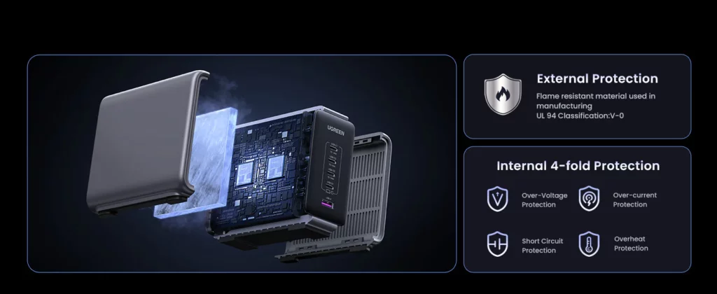 Wenig überraschend ist die Verarbeitungsqualität beim Ugreen Nexode 300W GaN Wall USB-C Charger sehr hoch. Die Buchsen wirken, als würden sie eine Menge aushalten, und dieser Eindruck bestätigt sich bei der ersten Verwendung dementsprechend. Genau so muss ein Charger aufgebaut sein, er hält ganz schön viel aus und gibt genau die Menge an Strom ab, die eure Produkte verlangen. So ist es ein Leichtes, auch zwei oder drei größere Geräte schnell wieder aufzuladen – Ugreen macht es möglich. Dass ihr dabei auch weniger Steckdosen benötigt und weniger Kabelsalat am Schreibtisch habt, ist ein ganz großer Bonuspunkt.