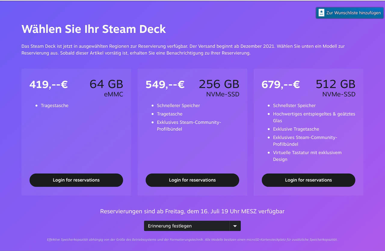 Andere Versuche, PC-Handhelds zu bauen, hatten schon immer so ihre Problemchen. Da ist einerseits die Hitzeentwicklung moderner Prozessoren zu erwähnen, andererseits aber auch die deshalb begrenzte Akkulaufzeit. Nicht umsonst laufen die Nintendo Switch und die aktuellsten Apple-Geräte wie MacBook Air oder iPad auf der weitaus effizienteren ARM-Architektur. Doch die Hardware des Steam Deck klingt durchaus stark, man darf gespannt sein, was uns Ende des Jahres erwartet, wenn die Geräte auch ausgeliefert werden. Vorbestellungen sind ab heute möglich, sofern euer Steam-Account vor Juni 2021 einen Kauf bei Steam getätigt hat. Eine kleine Reservierungsgebühr ist erforderlich, und nur eine Konsole kann pro Konto reserviert werden.