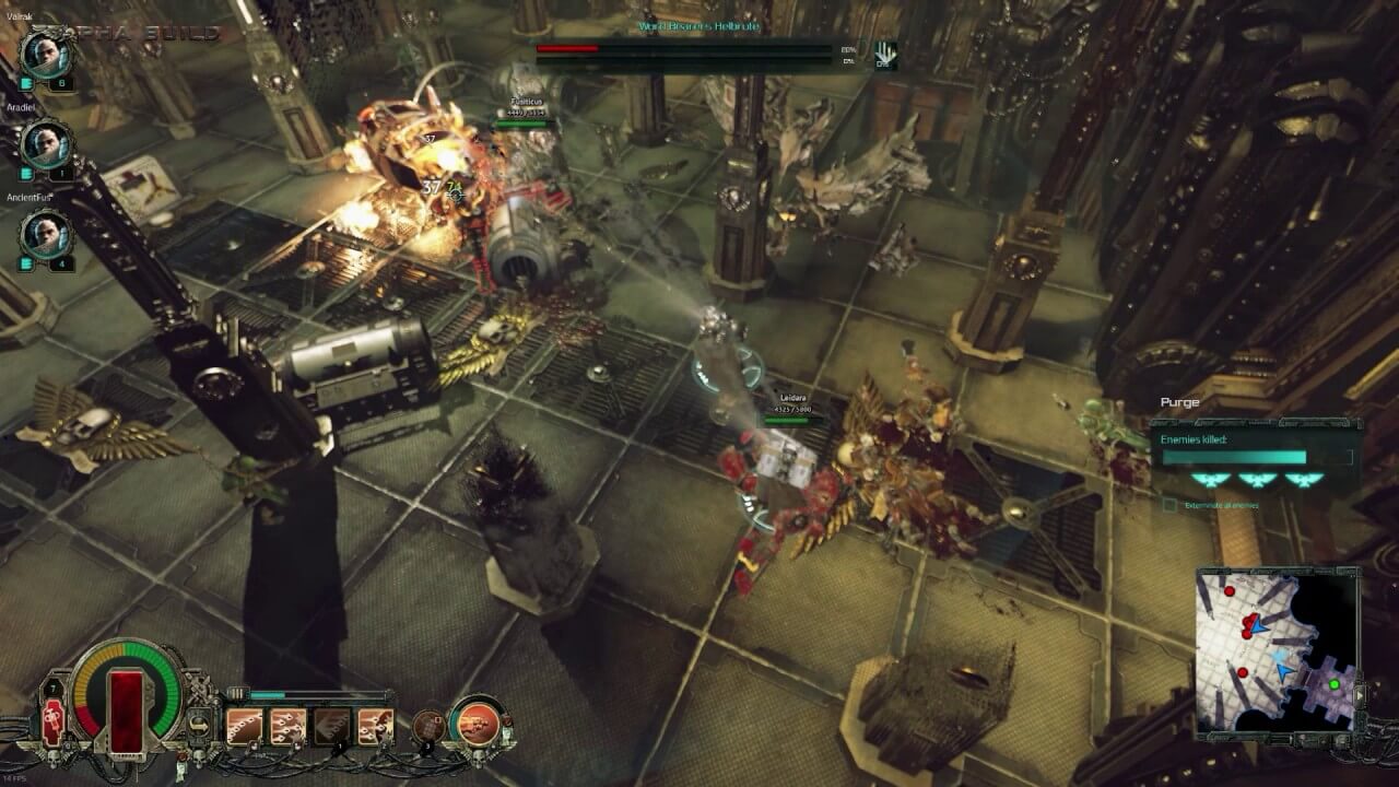 Ihr steuert euren Inquisitor aus der genretypischen Vogelperspektive wahlweise mit der Maus oder dem Gamepad. An manchen Stellen bietet euch das Spiel eine Deckungsoption an, die ihr aber abhängig von der gewählten Klasse eher selten bis gar nicht benötigen werdet. Die Linke und rechts Maustaste, sowie vier weitere Aktionstasten stehen euch als Kampfrepertoire zur Verfügung. Anders als in Diablo könnt ihr die Aktionen nicht frei aus einem Talentmenü wählen, stattdessen bietet jeder Waffentyp im Spiel ein gewisses vorgefertigtes Set an Talenten. Mit einem Großschwert ausgestattet könnt ihr beispielsweise einen mächtigen Wirbelangriff ausführen, während Shotguns mächtigen kegelförmigen Flächenschaden austeilen. Des Weiteren könnt ihr Granaten oder Mienen mit euch führen, und eine Ultimate-Fähigkeit einsetzen, die zum Ausführen ein gewisses Ressourcenlimit benötigt.