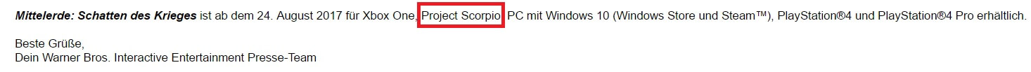 Schlampigkeitsfehler oder weiß Warner Bros. Interactive bereits mehr über ein mögliches Project Scorpio Release. In einer aktuellen Presseaussendung zu Mittelerde: Schatten des Krieges wird erwähnt, dass das Spiel ab 24. August 2017 für Xbox One, Project Scorpio, PC mit Windows 10 (Windows Store und Steam), PS4 und PS4 Pro erhältlich sein soll.