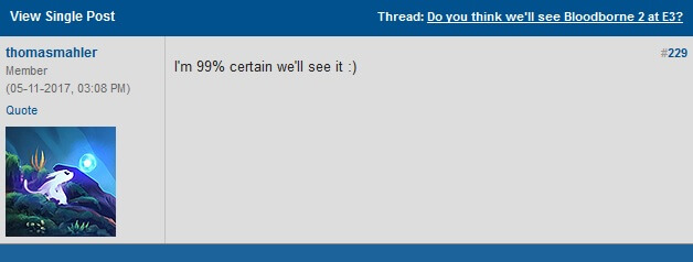 Im NeoGAF-Forum, in dem auch viele BrancheninsiderInnen vertreten sind, wurde diskutiert, ob die Fortsetzung des Souls-like-Hardcore-Actionspiel auf der diesjährigen E3 sein wird. Laut der Diskussion gibt es Hoffnung dafür. Wer nun hofft, dass sich jemand von From Software zu einem Indiz hinreißen ließ, wird leider enttäuscht. Dafür rechnet Thomas Mahler, der CEO der Moon Studios (Ori and the Blind Forest), mit 99%iger Sicherheit mit einem E3 2017 Bloodborne 2-Auftritt überzeugt ist.
