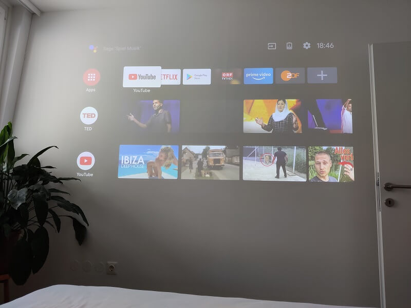 Neben einem schicken Design sind für mich zwei Dinge maßgebend: Die Inbetriebnahme und die Ton-/Bildqualität. Dem ersten meiner zwei Punkte möchte ich mich gleich hier widmen. Sind wir uns mal ehrlich, niemand will zu einer Bedienungsanleitung greifen, wenn man ein Gerät das erste Mal einschaltet. Zumindest geht es mir so. Ich habe den Anspruch, dass alles intuitiv von Statten geht und das Ding einfach rennt. Und genau so läuft das auch beim XGIMI Halo ab. Google-Konto hinterlegt und schon können die Wunsch-Apps (z.b. ZDF Mediathek, ORF Mediathek, Netflix und Amazon Prime) installiert werden. Auch Spiele könnt ihr beispielsweise über das super intuitive AndroidTV-System herunterladen. Einzig mit Netflix gab es ein Kompatibilitätsproblem, das ich bis jetzt noch nicht lösen konnte. Abseits davon gab es keinerlei Probleme.