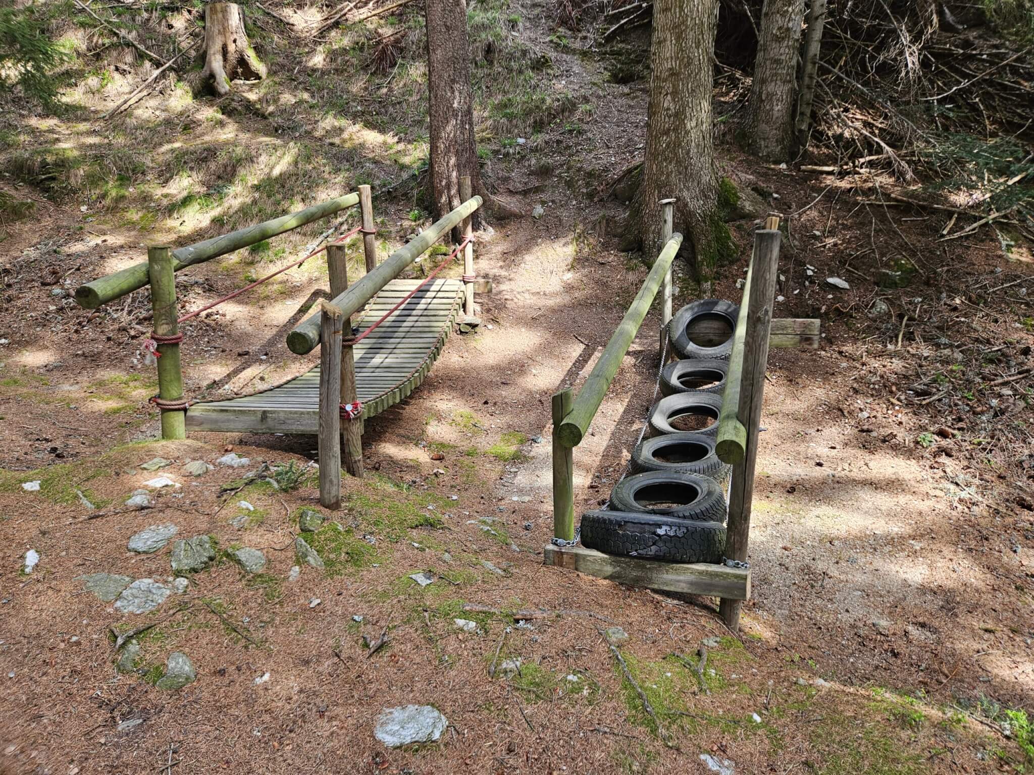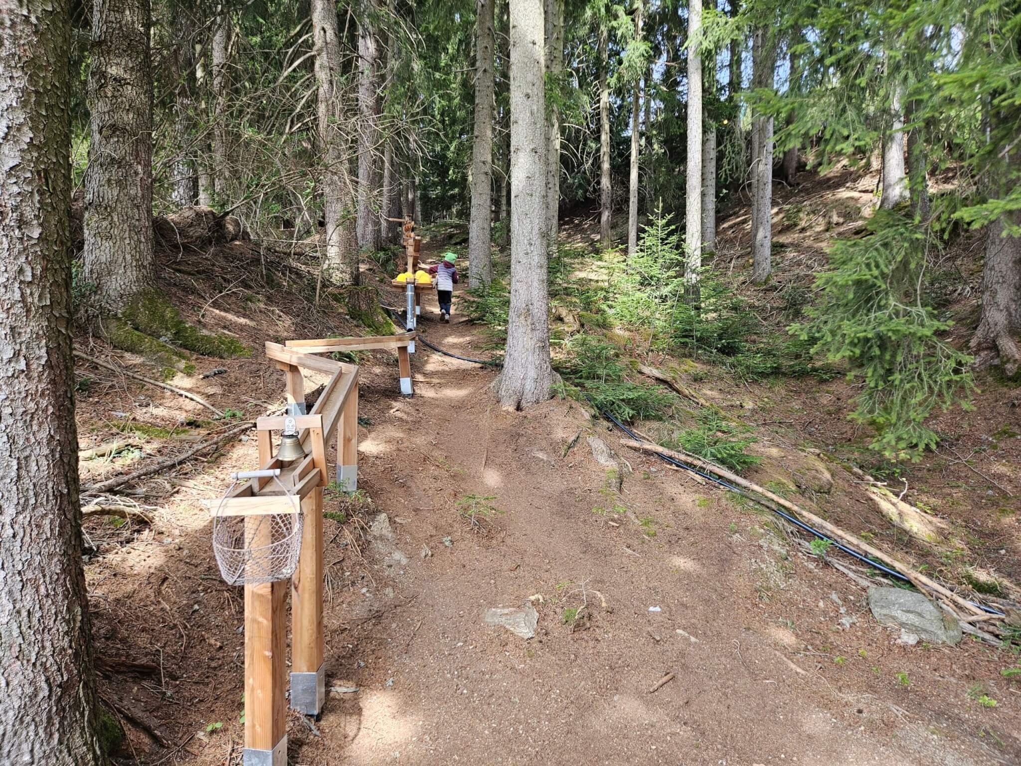 Doch die Märchenfiguren sind erst der Anfang, denn der Wald ist gespickt mit kreativen Stationen, die Kinderherzen höher schlagen lassen. Besonders beeindruckend sind die Holzkugelbahnen, die vom Chef des Hotels höchstpersönlich mit viel Herzblut gebaut und ständig erweitert werden. Es macht unglaublich viel Spaß, die Kugeln über die meterlangen Bahnen zu jagen, an verschiedensten Holzhindernissen, ja sogar an ein paar Bauarbeiterhelmen geht es vorbei. Eine ebenfalls tolle Idee war für uns die Wasserpumpstation, die exakt so aussieht wie die, die bei meinen Großeltern im Garten stand, um im Sommer die Blumen zu gießen. Hier können die Kinder nach Herzenslust Wasser in hölzerne Rinnen pumpen und beobachten, wie die unterschiedlichen Ströme mehrere Mühlräder nacheinander in Bewegung setzen. Noch dazu gibt es wacklige Holz- und Reifenbrücken und gespannte Seile, wo die Kinder durch den Wald balancieren können. Innerhalb eines überschaubaren Areals (das Waldstück ist noch größer und kann noch weiter erkundet werden), konnten wir einen gesamten Vormittag verbringen und immer neue Dinge entdecken .